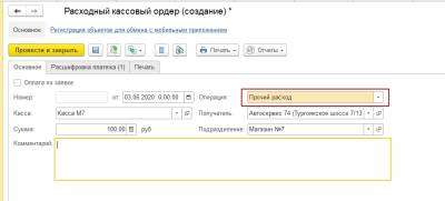 1.Оформить РКО с видом операции Выдача в кассу ККМ