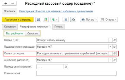4.Создать Расходный кассовый ордер на основании документа Возврат от розничного покупателя