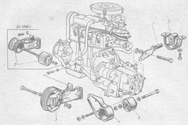 До 1988 г. конструкция всех эластичных опор подвески двигателя была иной (см. рис. 3), с другими характеристиками по упругости, причем передняя опора запрессовывалась в обойму кронштейна (как левая опора). При ремонте на автомобили выпуска до 1988 г. можно устанавливать левую опору новой конструкции, но переднюю и заднюю опоры необходимо ставить только старой конструкции, так как у них другие установочные размеры (выведены из эксплуатации на текущий момент)