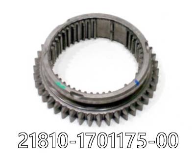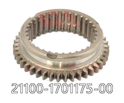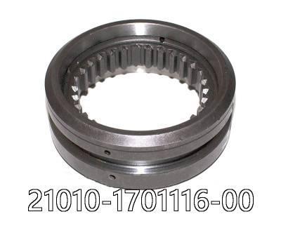 21100-1701175-00 - муфта синхронизатора I-II передачи. Легко отличить от прочих по наличию наружного зубчатого венца, т.к. муфта выполняет еще и роль ведомой шестерни заднего хода.