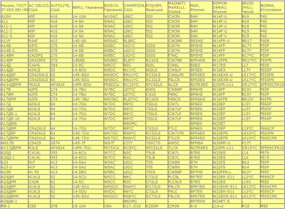 В маркировке свечи зажигания указываются ее геометрические и посадочные размеры, особенности конструкции и калильное число. Разные производители имеют свою систему обозначений. Ниже приведены маркировки, применямые российскими и ведущими зарубежными изготовителями, а также таблица взаимозаменяемости свечей разных марок.