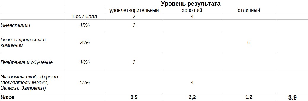 Каждое предложение об улучшении и результат его внедрения оцениваются последующей таблице.