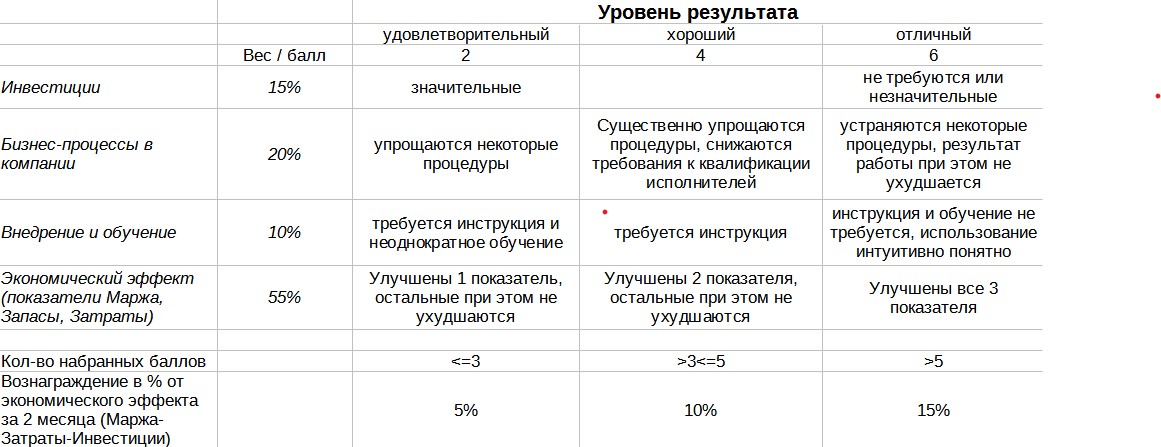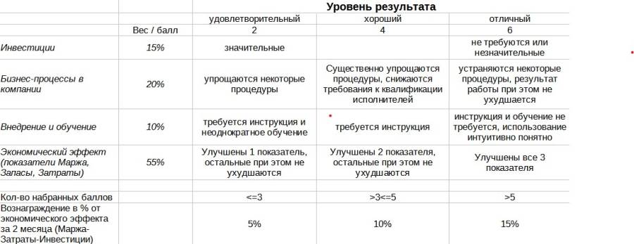 Каждый сотрудник, предлагая улучшения работы компании, должен знать что эти предложения важны и ценны для компании. Далее представлена система, которая позволяет оценить предлагаемое улучшение и результат от его внедрения не субъективно, «на глазок», а по определенным правилам. Это значит, что такую оценку может дать не только руководитель, но и сам сотрудник, а значит понять ценность или бесполезность своего предложения. В зависимости от результата оценки, сотрудник может претендовать на вознаграждение в результате внедрения предложенных улучшений.