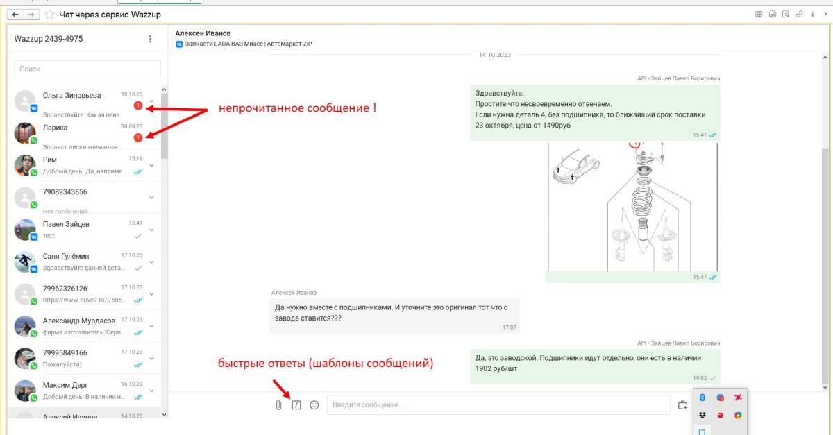 Интерфейс аналогичен интерфейсам декстоп-версий Whatsapp и Telegram. Обратить внимание нужно на красные кружки рядом с контактом, это значит, что есть неотвеченное сообщение. Он не пропадет, пока клиенту не ответят.