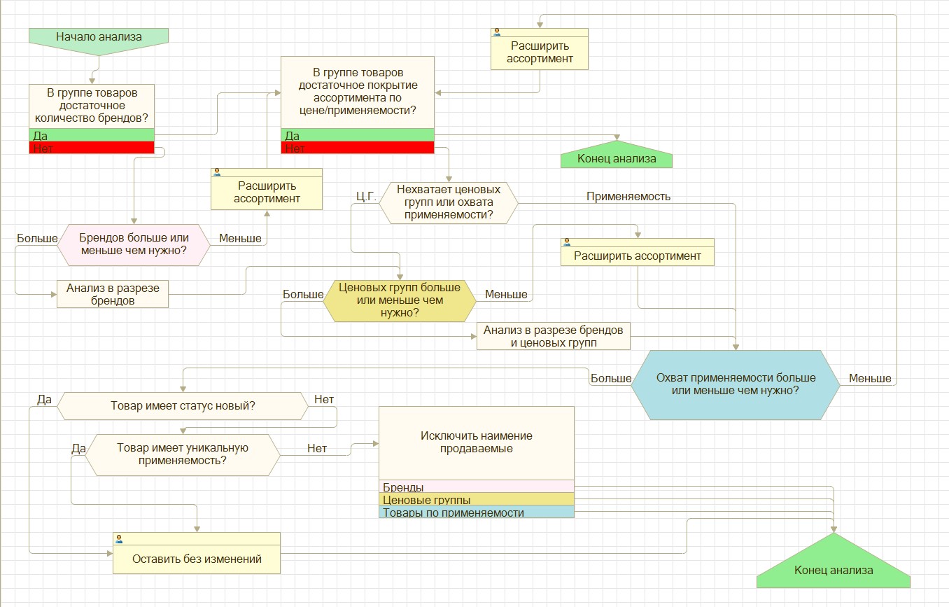 - Анализ по бренду: на данном этапе анализируется покрытие ассортимента по цене/применяемости товара. Выявляются дефицит и излишки по ценовым группам и применяемости товаров.