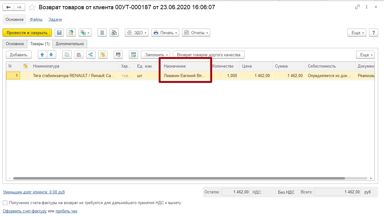 - В случае, когда товар пришедший под заказ нужно вернуть, даже при закрытом заказе, необходимо в документах движения товаров по обратной цепочке (возврат товаров от покупателя, перемещение, расходный/приходный ордер, возврат товаров поставщику) необходимо заполнять назначение в соответствующей последовательности (см ниже).
