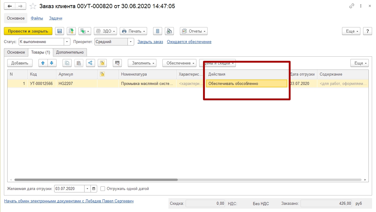 - При формировании заказа клиента на отсутствующий товар на складах всегда в колонке «Действия» указывается «Обеспечивать обособленно». Это является точкой начала резервирования товара по цепочке документов. Если в этой колонке указано «К обеспечению», то резерва по этому заказу не будет, и в последующих документах назначение не указывается.