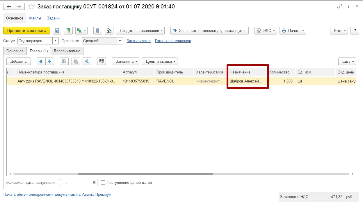P.s. Маленькая хитрость: чтобы каждый раз не подбирать необходимое назначение вручную, нужно скопировать его из заказа поставщику комбинацией Ctrl + c и комбинацией Ctrl + v вставлять в последующих документах. Как правило, в заказа поставщику с назначениями проблем нет.