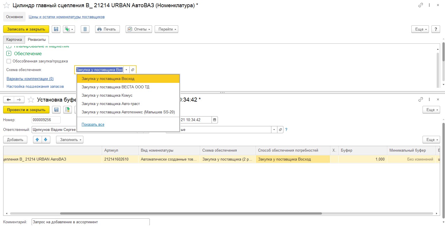 - Если по изначальному артикулу/кат. номеру ничего не найдено, имеет смысл воспользоваться альтернативными предложениями в виде аналогов для данного товара. В таком случае можно либо предложенную номенклатуру отредактировать (если это новая номенклатура, которая ранее не поступала), либо создать новую и её внести в «Установку буферов запасов» взамен предыдущей);