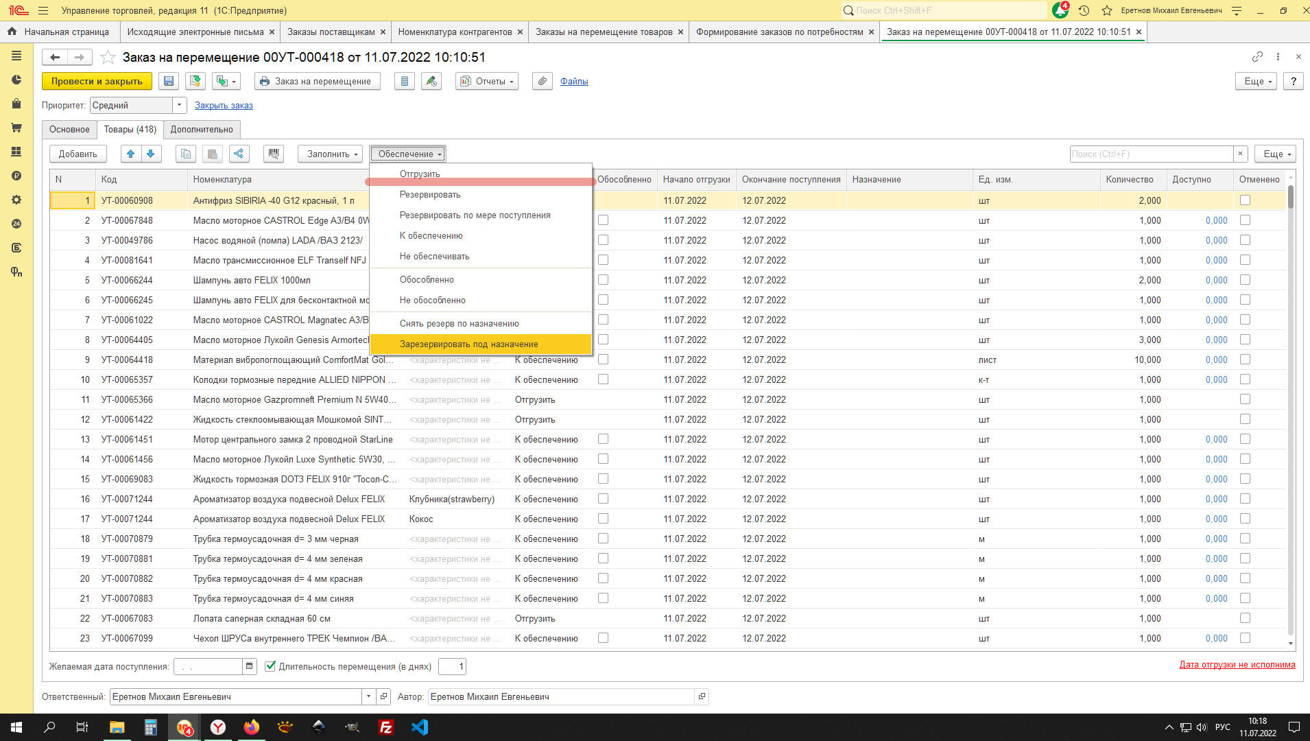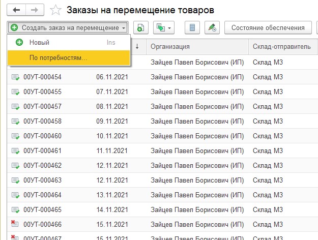 Перед формированием заказов поставщикам необходимо сделать «Заказ на перемещение», чтобы обеспечить потребности периферийного склада.