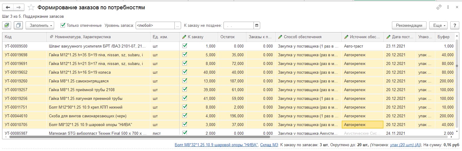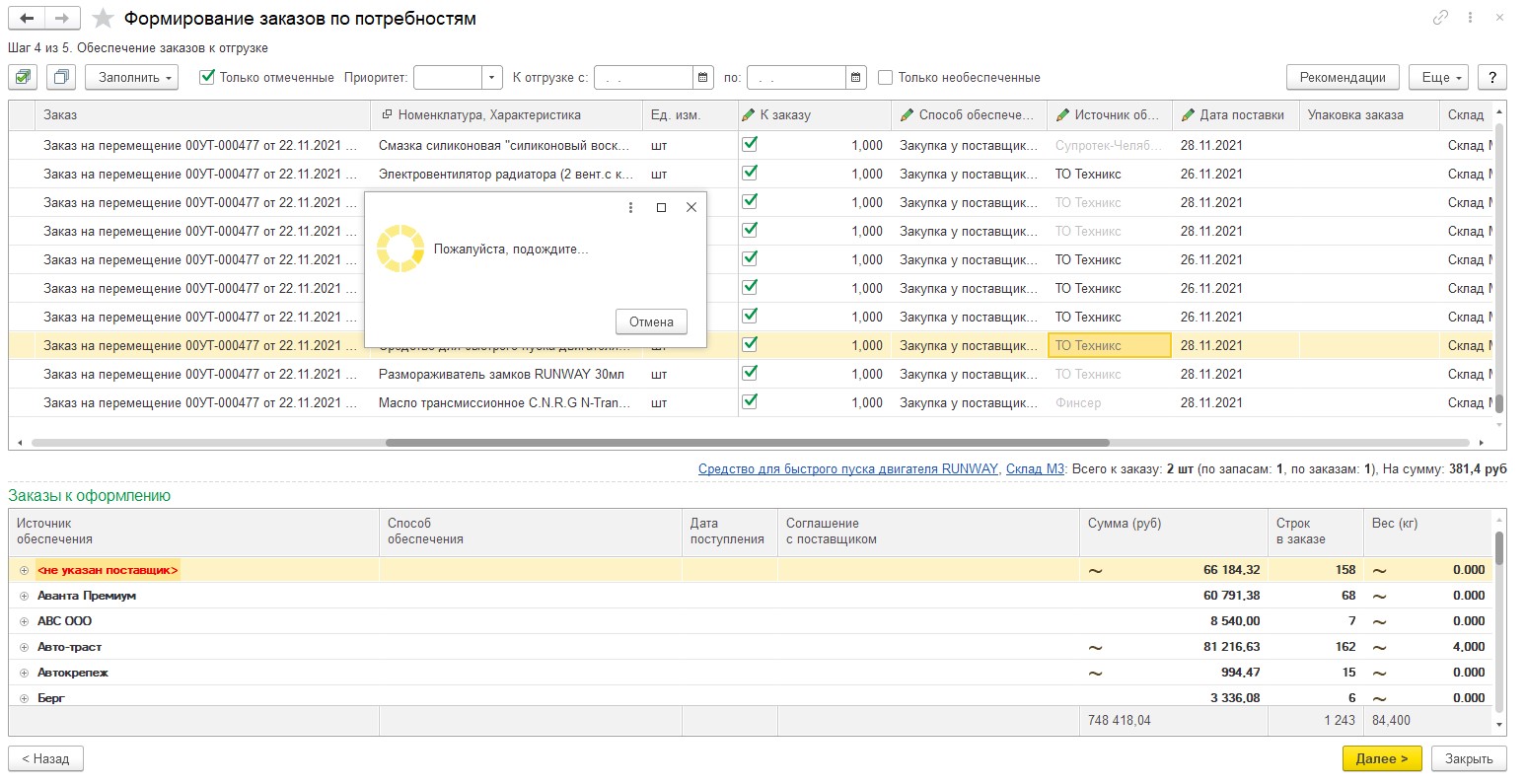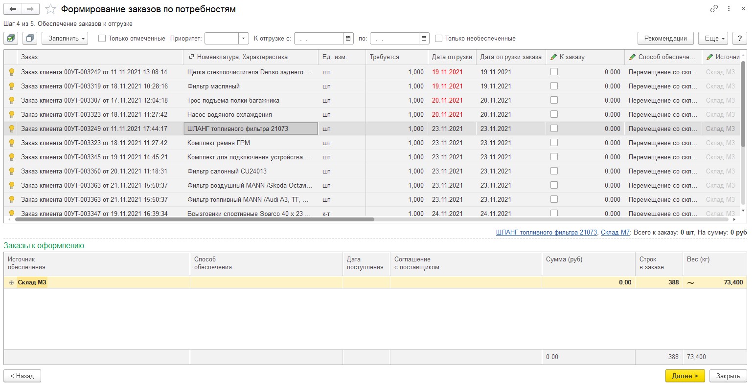 На шаге 4, необходимо проверить, чтобы ни одна строка не была отмечена к заказу. В противном случае - необходимо разобраться, почему есть необеспеченный заказ на периферийном складе (из самой формы формирования заказов переходим по документу «Заказ клиента» и уточняем подробности у ответственного за заказ). Нажимаем «Далее».