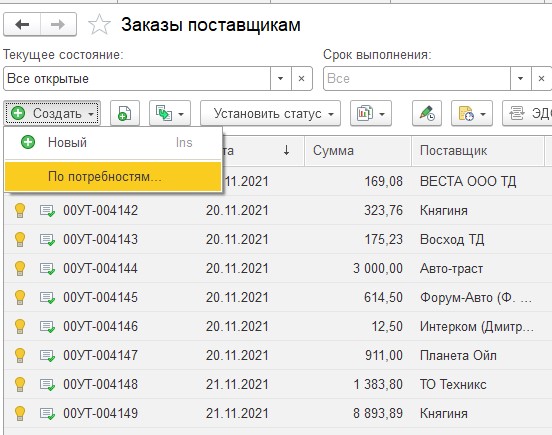 Для формирования заказ поставщикам переходим в регистр данных документов и создаем новые по потребности. Предварительно, необходимо убедиться что все ранее созданные заказы поставщикам были отправлены.
