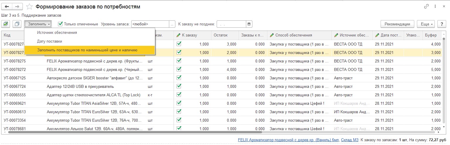 Шаг 1 и 2 - ничего не меняя, нажимаем «Далее». Из меню «Заполнить» вызвать команду подбора по цене и наличию.