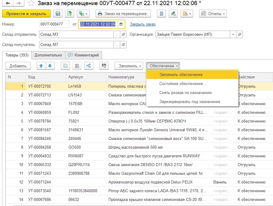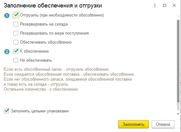 В сформированном заказе поставщику необходимо заполнить обеспечение. В списке заполнение обеспечения и отгрузки выбираем «Отгрузить (при необходимости обособленно)» и «К обеспечению. Заказ провести и закрыть.