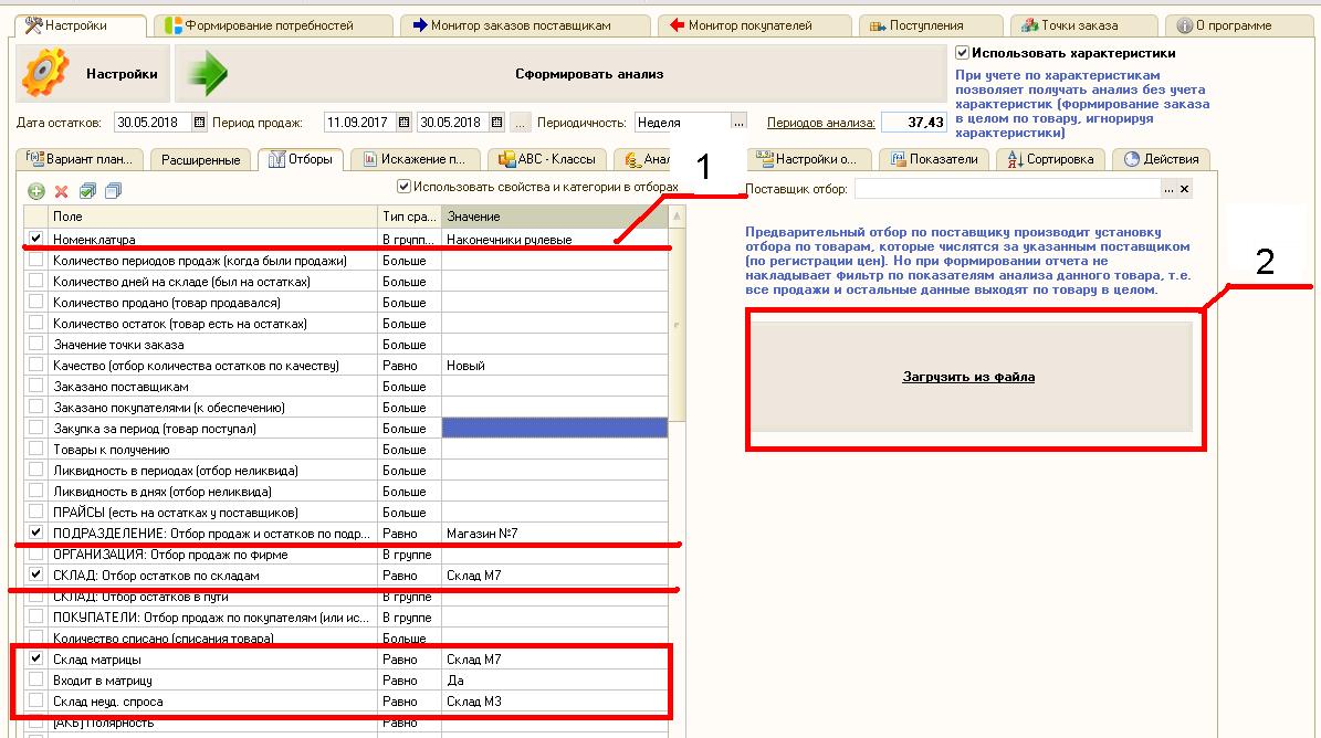 Основные настройки необходимые для работы с инструментом указаны в табличной части (1). Особое внимание следует обратить на поля « Для работы с заранее выбранным списком товаров следует пользоваться обработкой «Загрузить из файла» (2) в которую следует заполнять только кода номенклатуры из справочника. ВНИМАНИЕ!!! Работать одновременно с матрицами разных магазинов можно только при запуске двух учетных записей 1С.