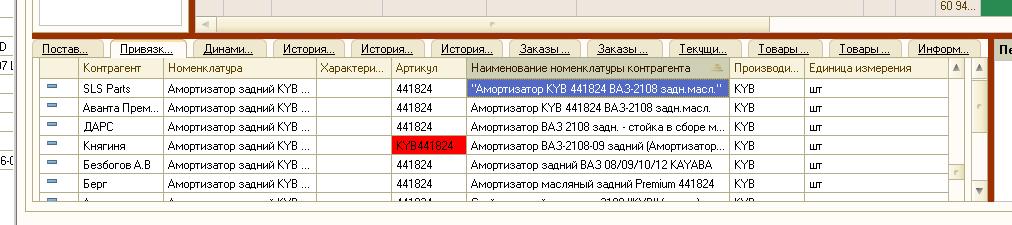 - Поставщики товара - показывает зарегистрированные текущие цены и наличие товара у поставщика. Ячейки выделенные цветом означают расхождения с номенклатурой справочника 1С.