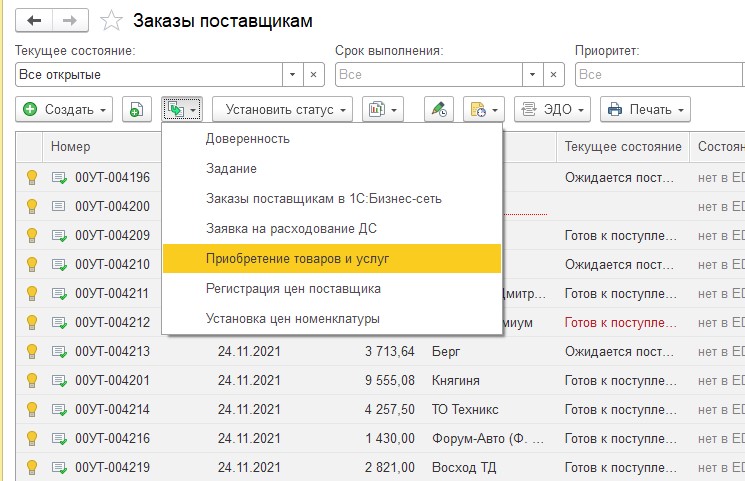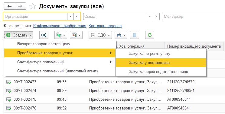 Создание документов приобретения можно осуществлять либо на основании заказа поставщику (для документов, объемом не более 10 строк):