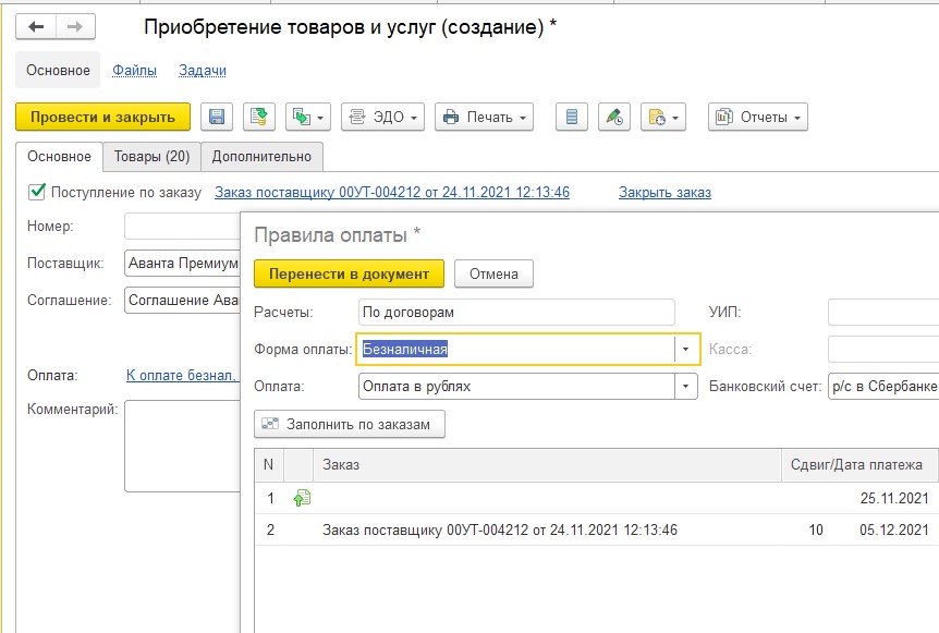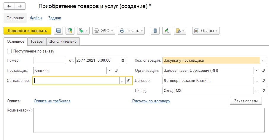 - Возвращаемся на вкладку «Основное» и ставим галочку «Поступление по заказу». Перезаполняем «Оплата», если не указана форма оплаты «безнал».