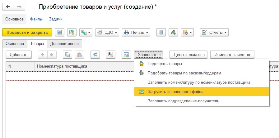 - На вкладке «Товары» а разделе «Заполнить» выполняем «Загрузить из внешнего файла».