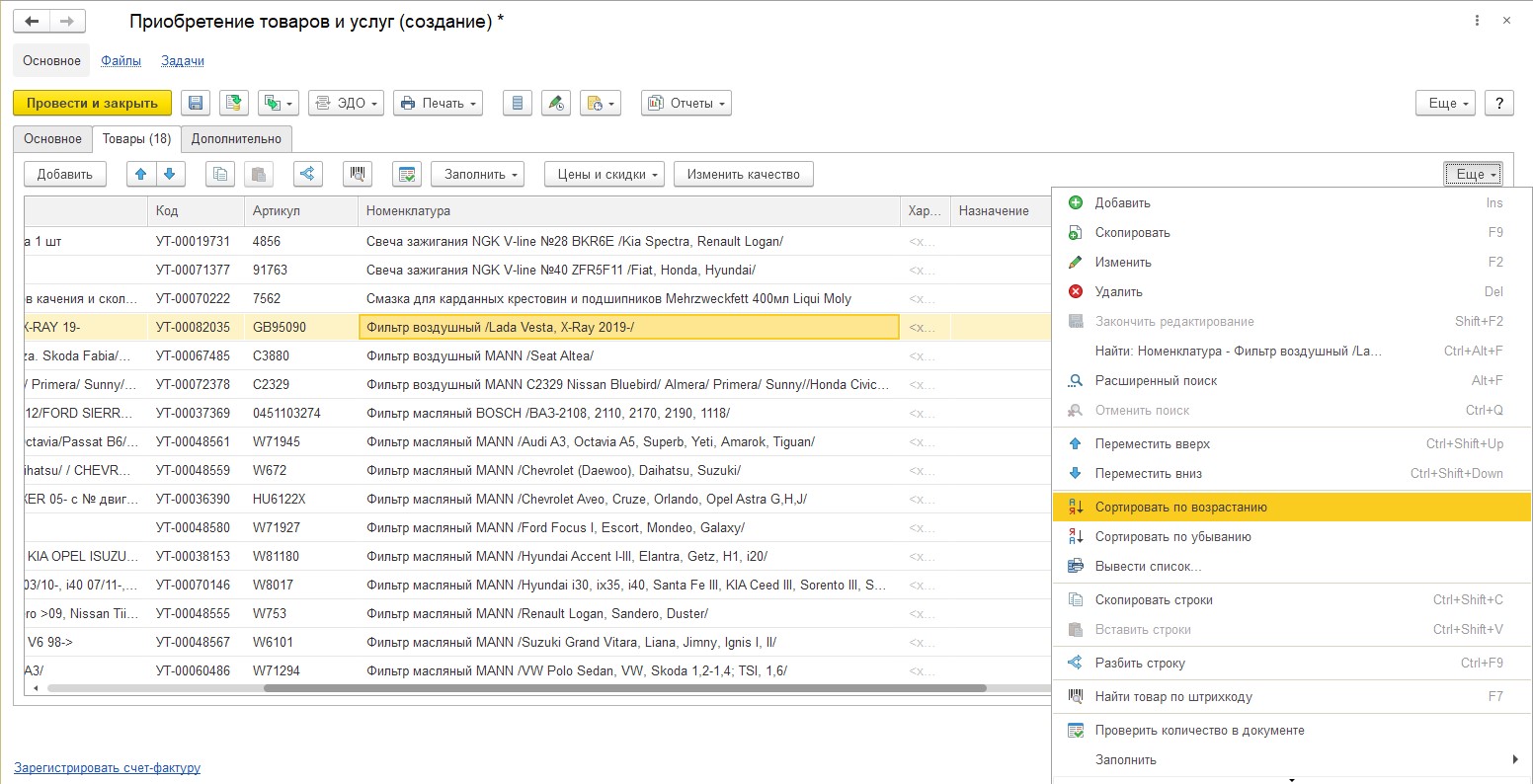 - На следующем этапе, необходимо проверить насколько корректно произошло сопоставление данных из файла с данными в БД. Для удобства стоит отсортировать по колонке «Номенклатура». Для не заполненных ячеек, необходимо подобрать корректный вариант (это одна из двух последних строк в раскрывающемся списке).