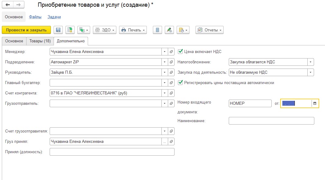 - На вкладке «Дополнительно» заполняем поля: «Менеджер», «Груз принял», «Номер входящего документа» и «От» (дата).