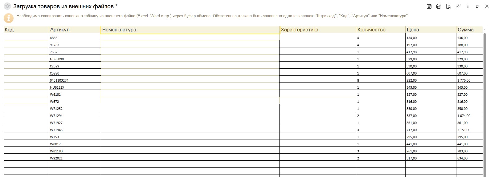 - В открывшейся форме необходимо заполнить следующие колонки: «Код»/«Артикул (в зависимости от того, что есть в УПД/накладной), «Количество», «Цена» и «Сумма».